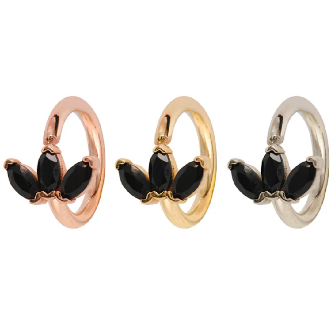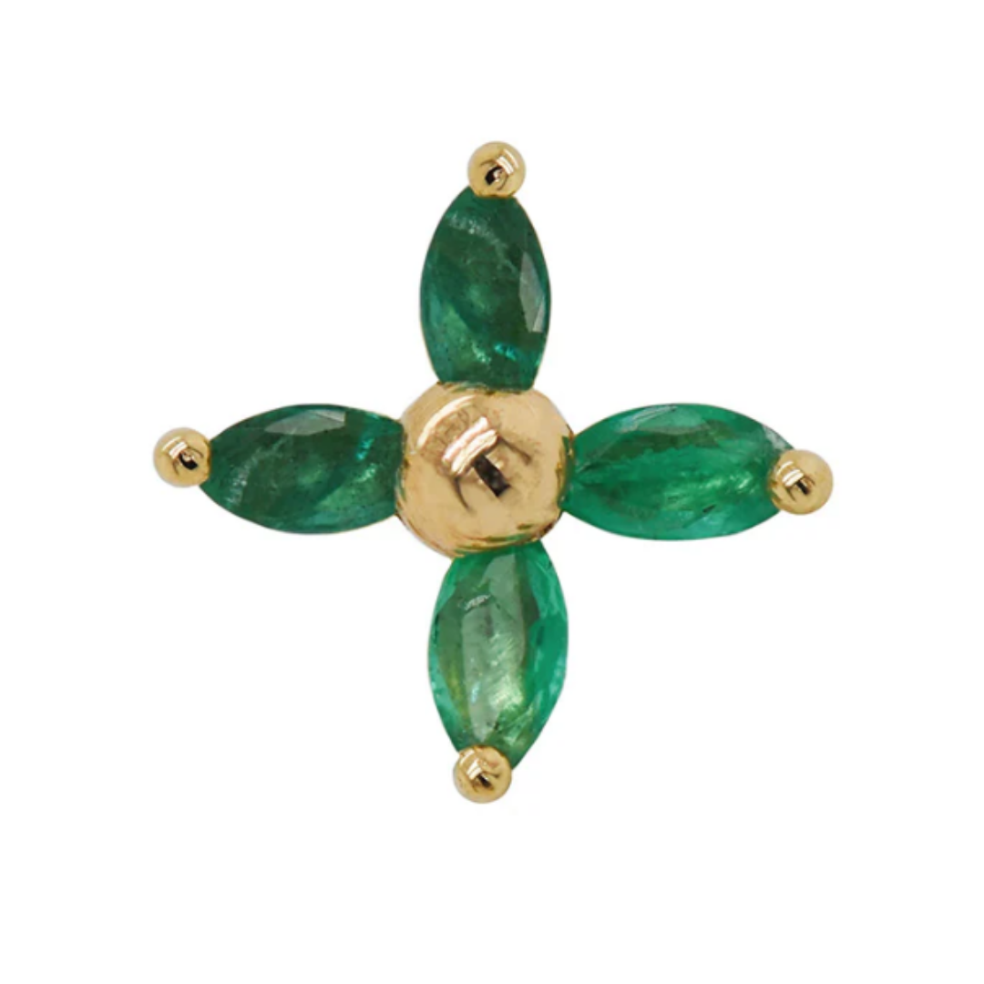 View HereSculptural gold ends with refined profiles and luminous gemstones, designed to sit low and comfortable in curated stacks. Threadless compatible and available in yellow, white and rose gold.