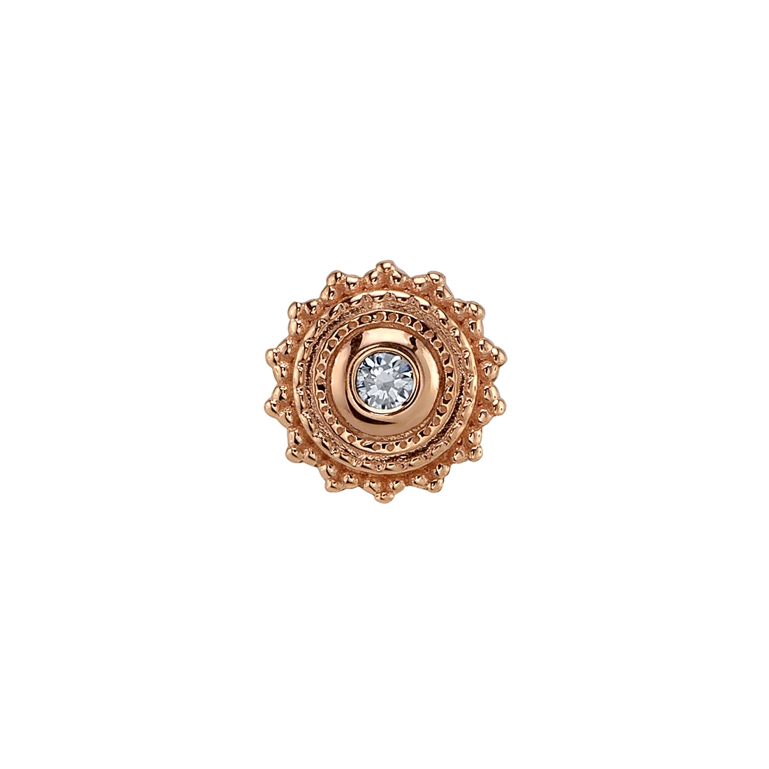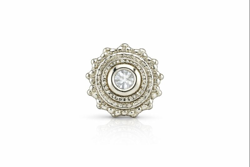 Afghan is a bold 6mm circular design with intricate beading and layered detail that creates depth from every angle. At its centre sits a 1.5mm white diamond, precision set to catch the light with sharp, clean brilliance. The surrounding gold work gives it a rich, architectural feel while keeping the overall profile refined and wearable.