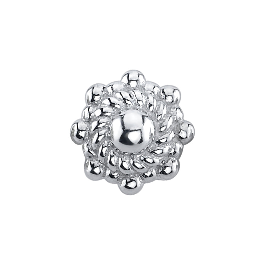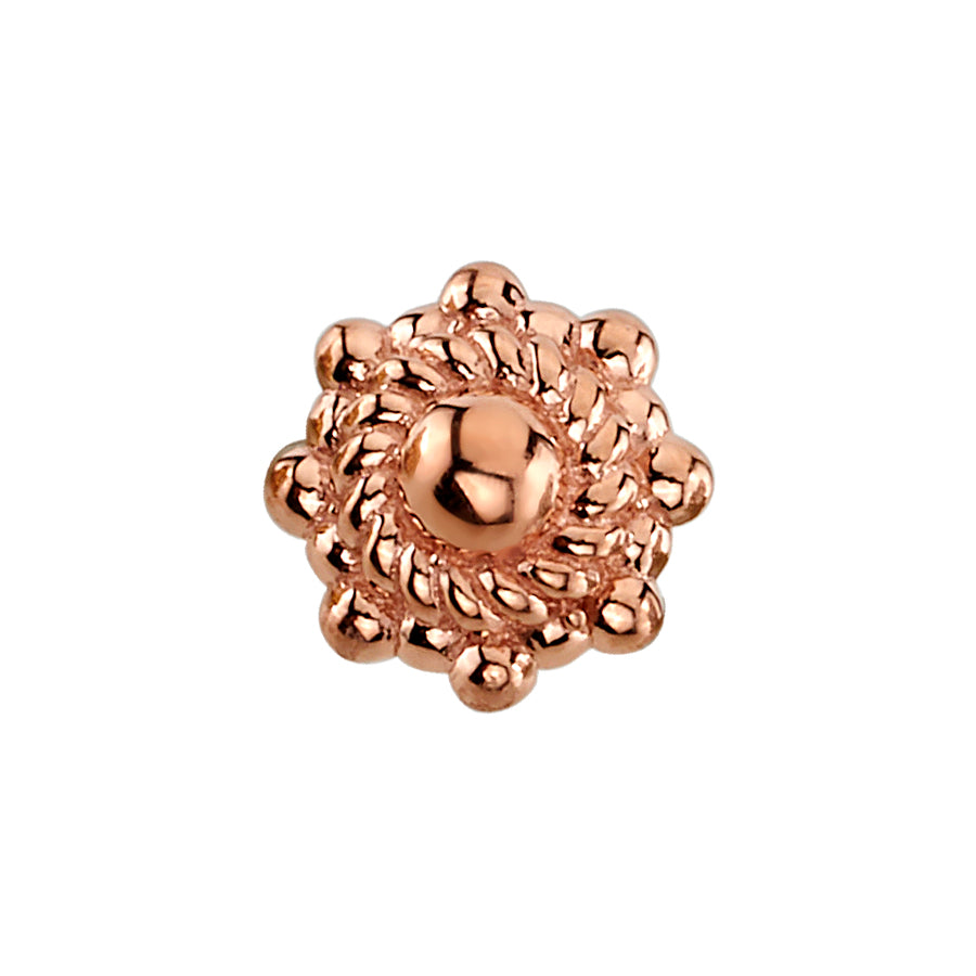 The BVLA Ares end is a striking celebration of texture and symmetry. This bold piece features a central high-polish bead surrounded by intricate layers of twisted and beaded gold, forming a beautifully detailed floral spiral. Its rich texture and dimensional design make it ideal for flat, helix, or conch piercings, adding visual depth and luxurious charm to any ear curation. Available in yellow, white, and rose gold, each Ares end is meticulously handmade to order, perfect for those who appreciate statement craftsmanship with timeless appeal.