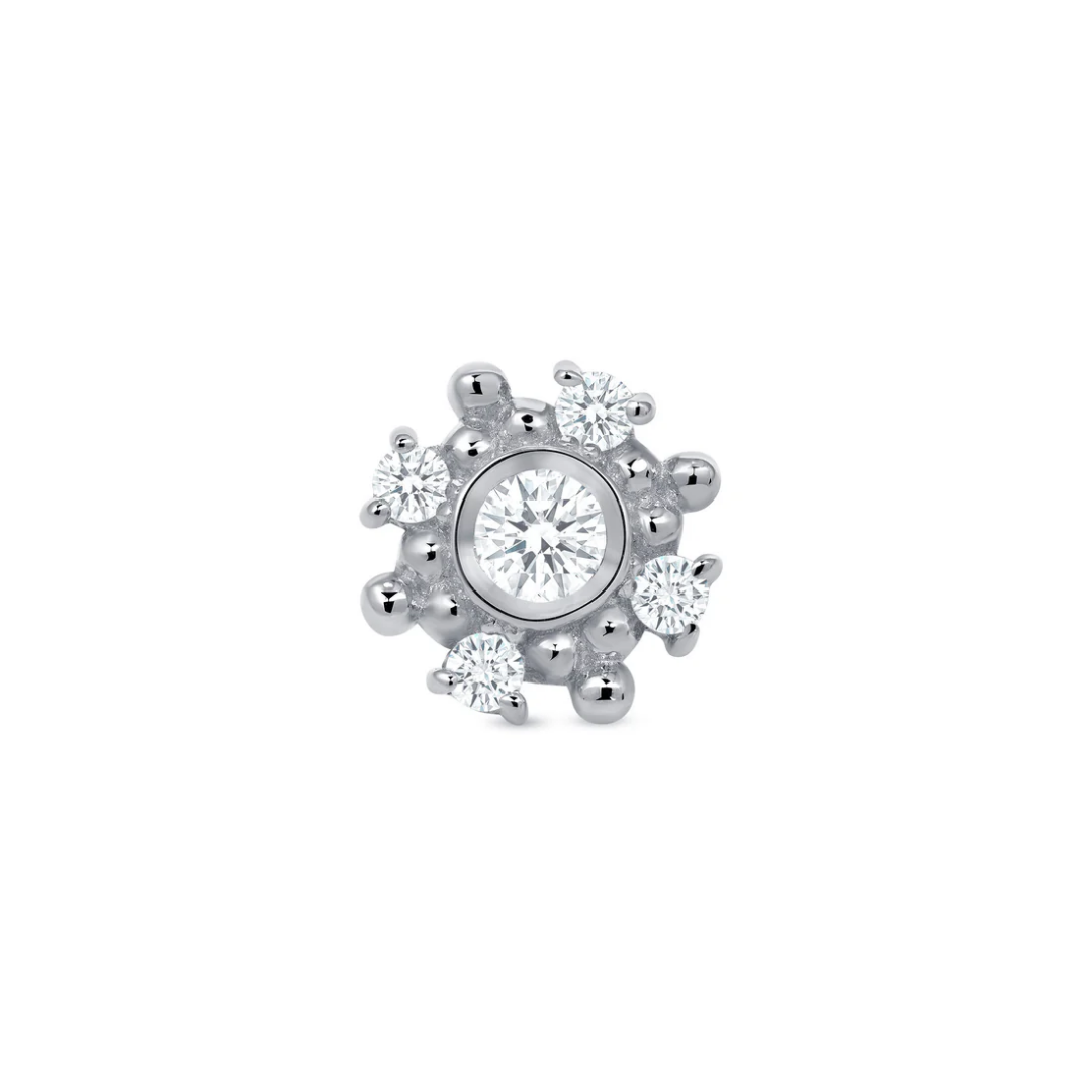 The Norvoch Astra end captures the brilliance of a celestial bloom, blending radiant sparkle with sculptural gold detailing. A central cubic zirconia is surrounded by delicate beadwork and smaller accent stones, creating a luminous, multidimensional effect. Perfect for conch or flat piercings, it’s a showpiece that adds refined luxury to any ear styling.
