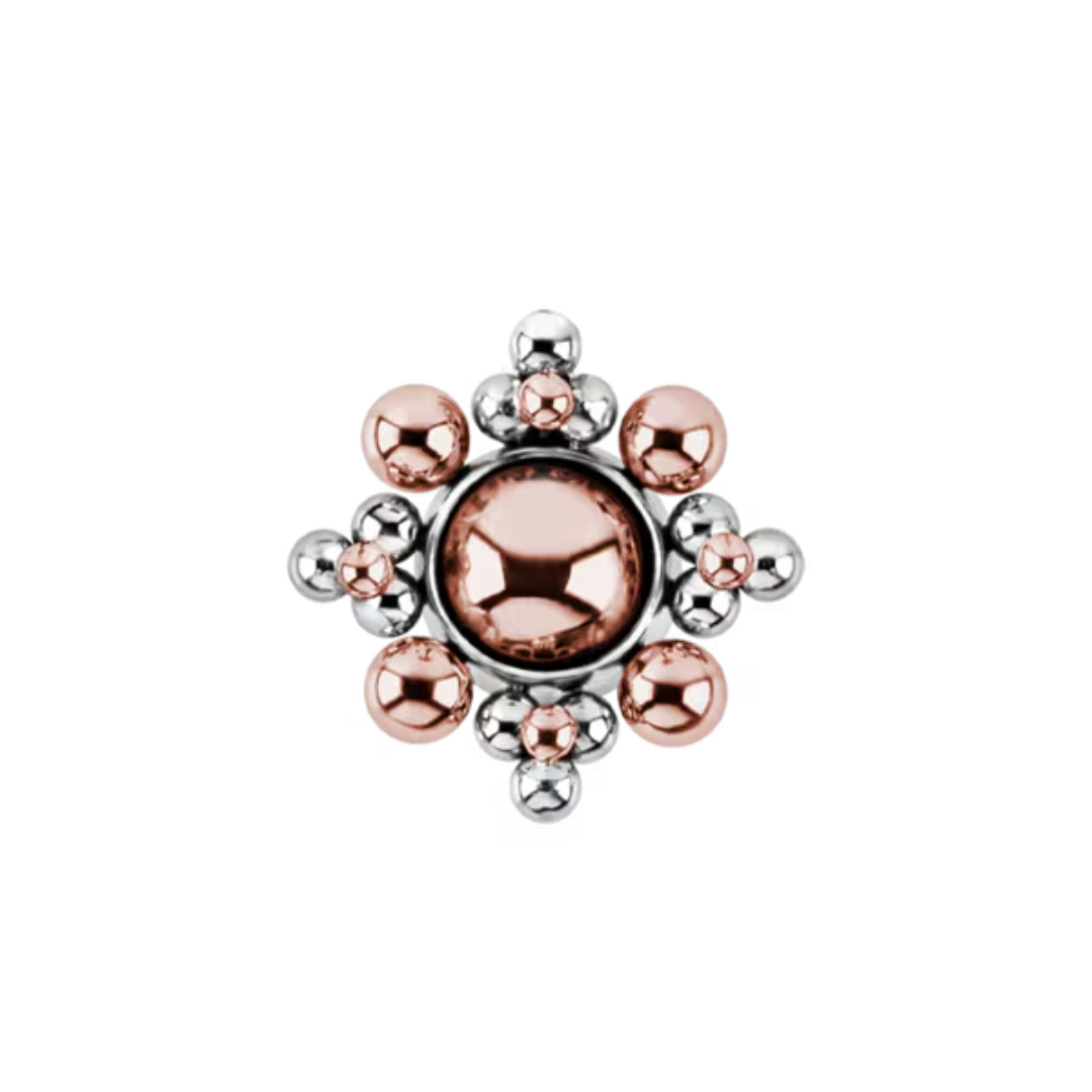 The Atria end by Le Roi blends bold structure with timeless detail. A central yellow or rose gold dome is surrounded by polished beaded accents, creating a radiant mixed-metal piece that works beautifully in a range of ear or facial piercings.