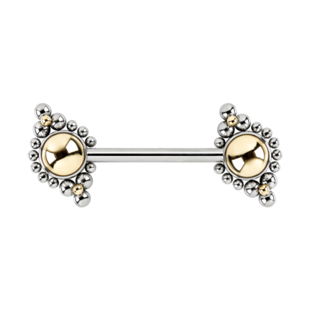 The Bellatrix Side-Set from Le Roi features a bold gold dome flanked by delicate titanium beadwork and micro gold accents. A beautifully structured hybrid piece, it pairs luminous detail with industrial elegance for a distinctive look across nipple piercings.
