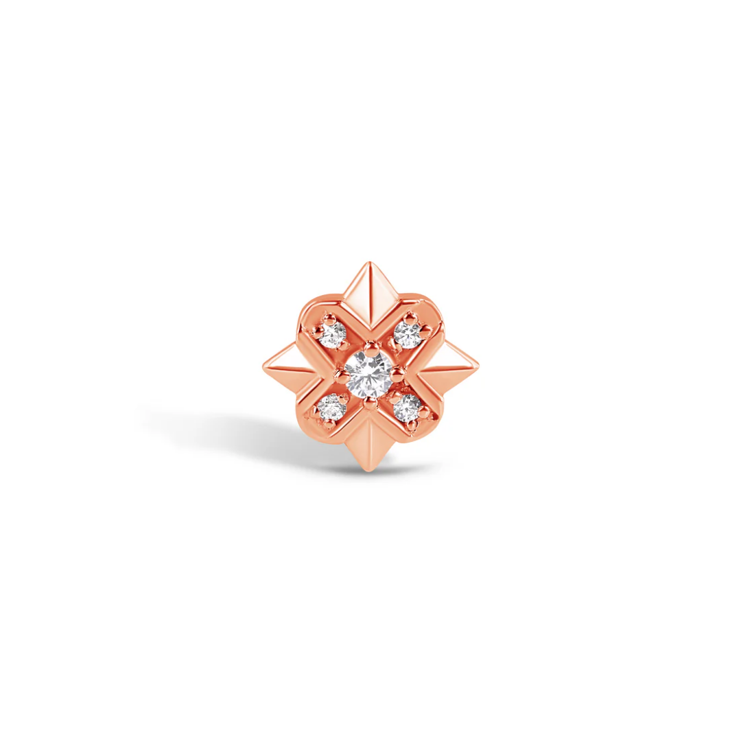 The Norvoch Cillian end offers a refined geometric bloom, combining polished gold facets with a constellation of bright CZ stones. Its sculpted eight point form creates dimensional shine, while the central stone adds a clear focal sparkle. Hand finished to achieve crisp edges and a flawless mirror polish, it brings a luxurious architectural touch to any curated ear. Designed to sit elegantly in lobe, helix, or flat placements, it delivers statement detail in a compact size.
