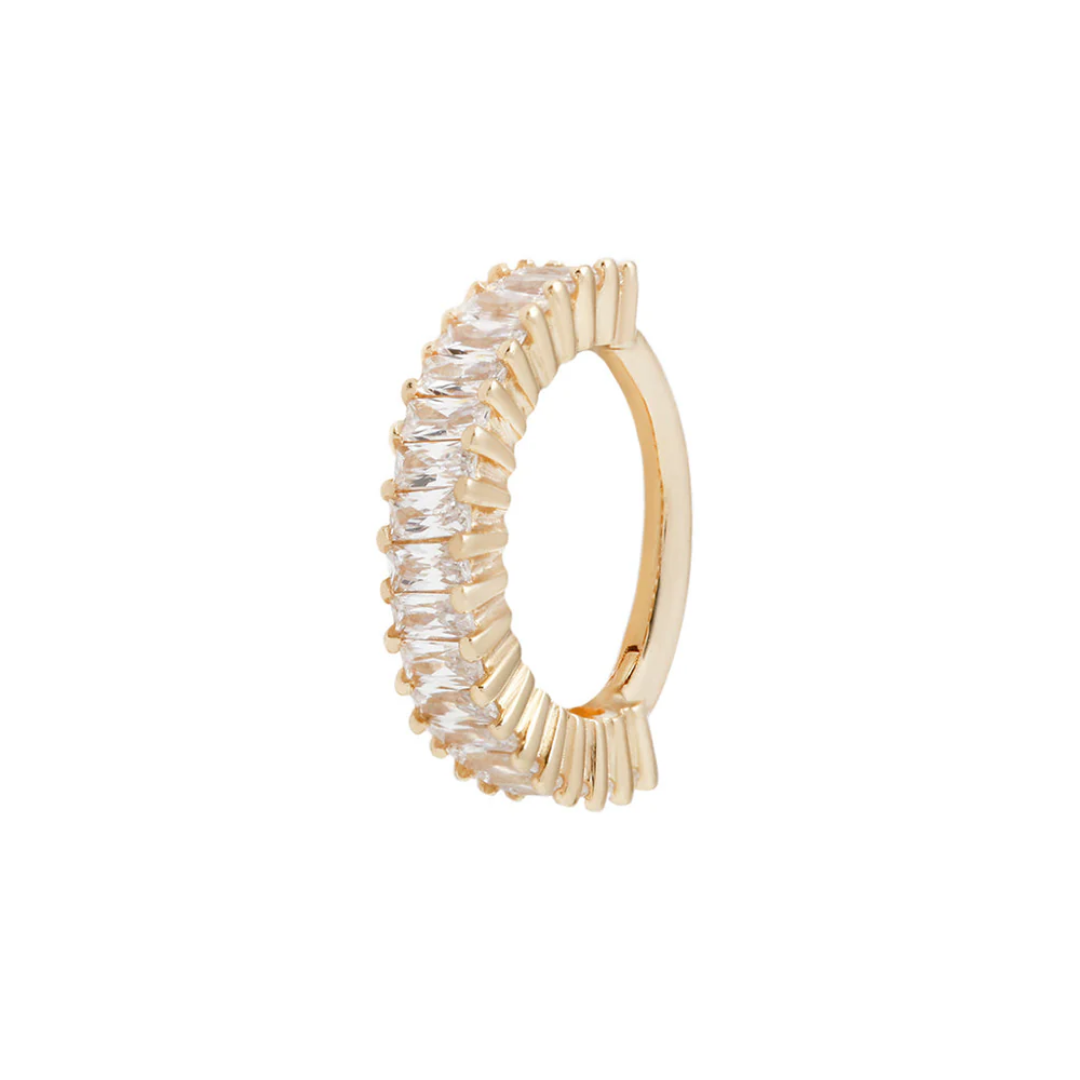 This jewelry piece is sure to be the star of the show! Our Cult Favorite clicker features (over 15) baguette Swarovski CZs in 14kt golden chic symmetry. Wear this on the lobe, helix, or daith for the perfect spot to showcase this masterpiece. Perfect for a elegant night out on the town!