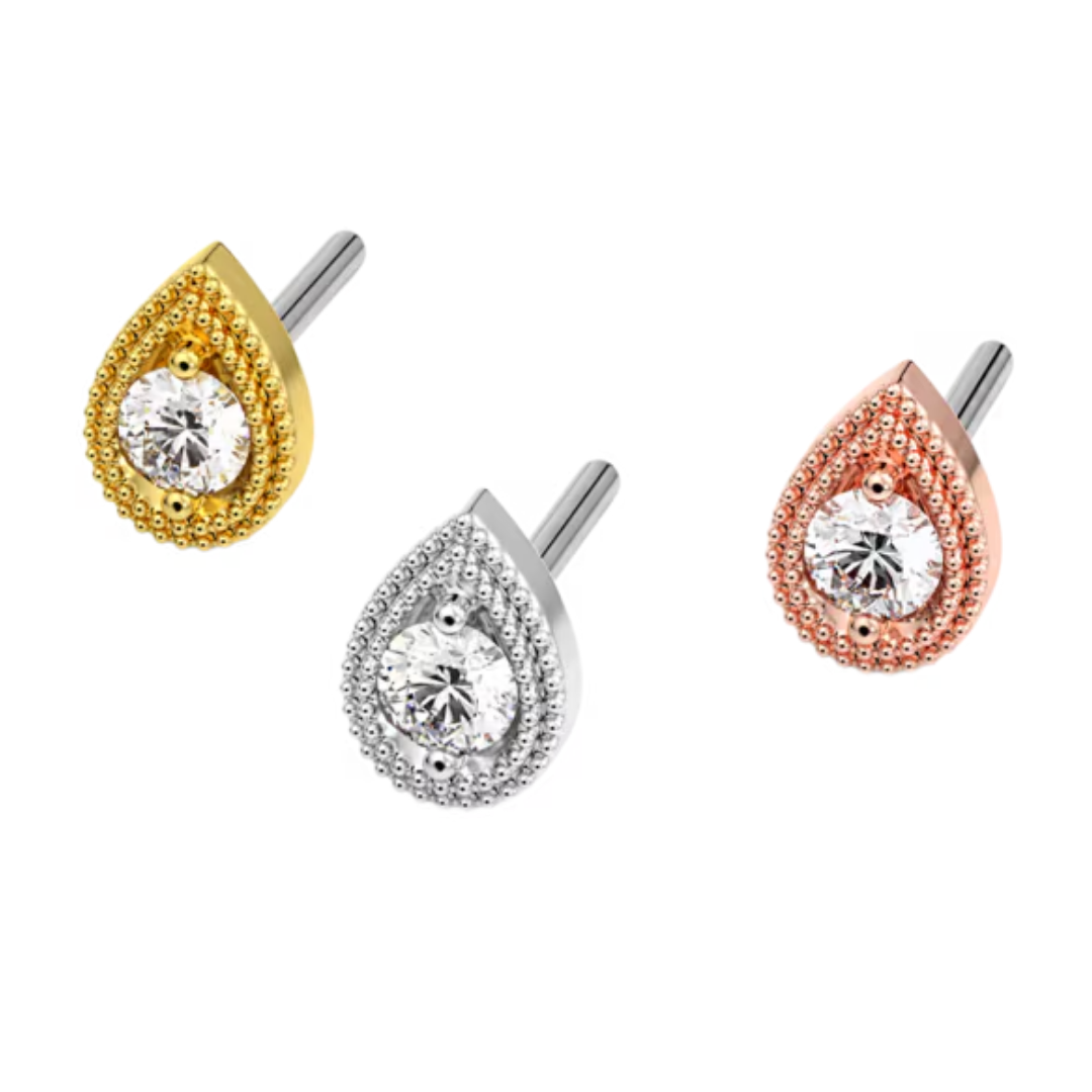 The Double Millgrain Pear by Le Roi is a 14k solid gold threadless end that exudes timeless elegance. Featuring a brilliant round stone framed by intricate double millgrain detailing in a graceful pear silhouette, it adds a refined touch of sparkle to any piercing. Available in yellow, white, and rose gold, this versatile design is a luxury classic for any curated ear.