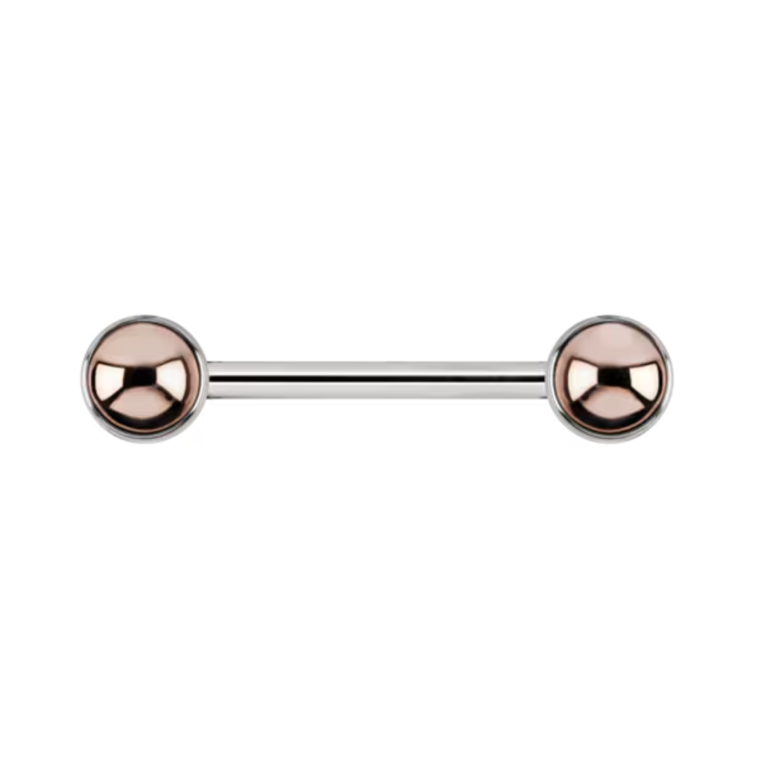 Doublette Side-Set Barbells are made with implant grade ASTM F-136 6AL 4V Eli Titanium. The hybrid design is available in 14k yellow & rose gold. Each piece has a superior hand polish.