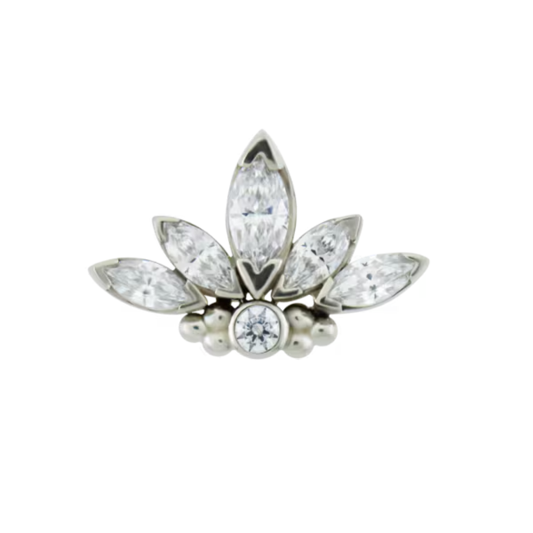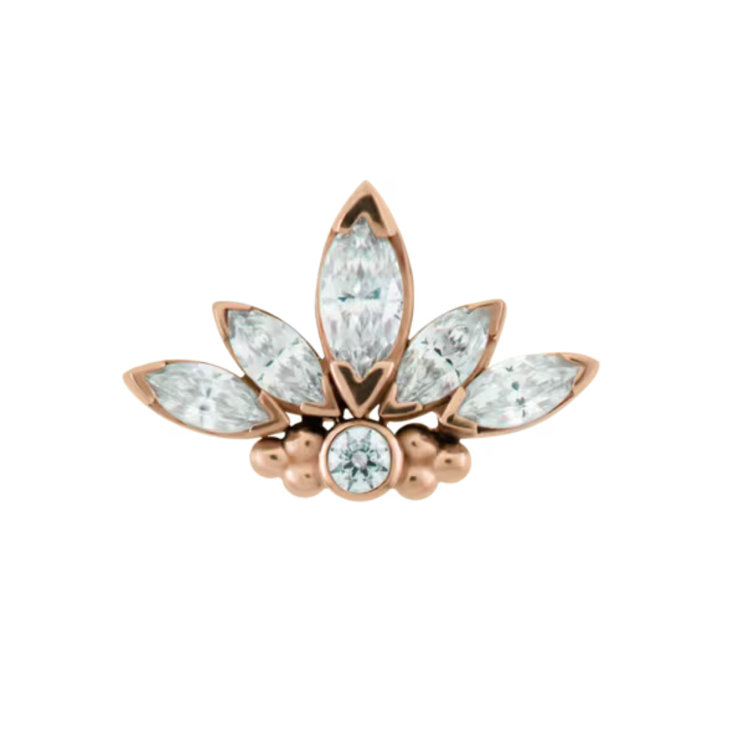 For those seeking the ultimate in fine jewellery, the Fay by Le Roi is crafted in 14k solid gold and set with lab created marquise-cut diamonds. A central bezel-set diamond is enhanced by five radiant marquise stones and polished gold beadwork, offering an opulent finish that elevates any piercing. Available in yellow, white, and rose gold, it’s a luxury investment piece designed to last a lifetime.