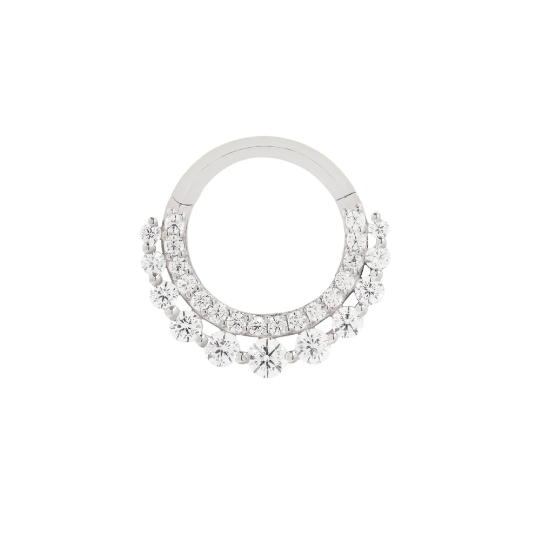 The Gl’amor clicker is pure sophistication, designed to shine in septum or daith piercings. With two rows of round faceted CZs set in your choice of yellow, white, or rose gold, this piece brings a touch of high-fashion sparkle to any look.