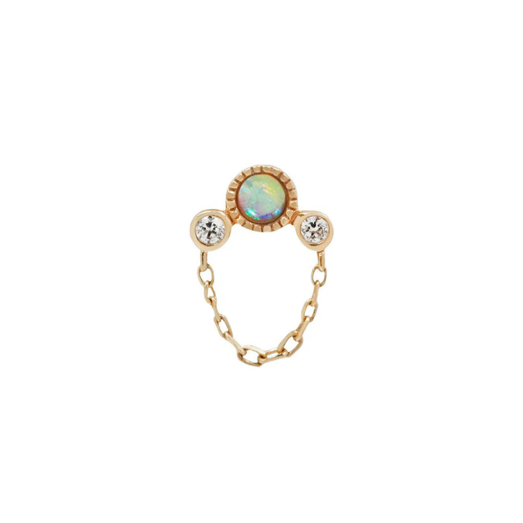 The Halston features a genuine white opal adorned with Swarovski crystals and a delicate chain for extra style and additional movement!