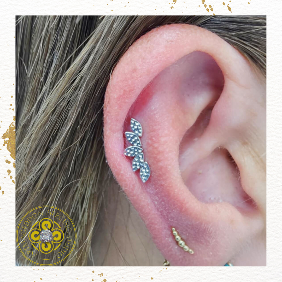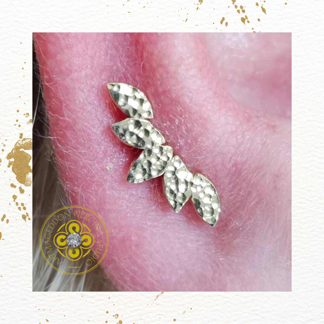 The BVLA Hammered Serenity end in 14k gold is a graceful blend of texture and flow. Featuring five marquise-shaped leaves with a hand-hammered finish, it curves naturally along the ear to create a fluid, organic look. Elegant yet bold, it brings warmth, depth, and artisan craftsmanship to any curated piercing.