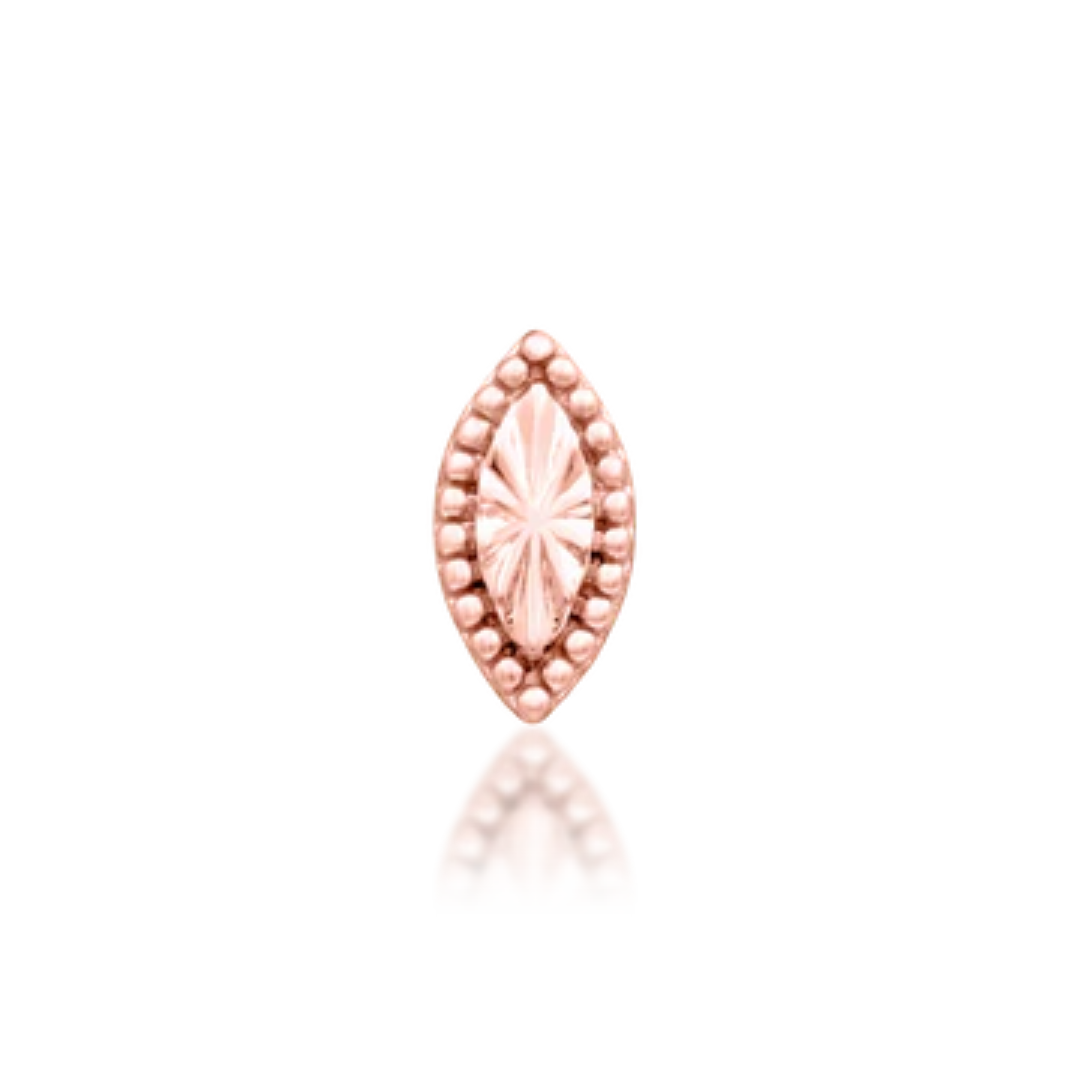 Understated with a touch of texture, the Novie end in 14k gold features a marquise-shaped silhouette with a starburst engraving, framed by a border of polished gold beading. This sleek and versatile piece brings subtle shine and vintage-inspired elegance to your ear curation — ideal for flat, tragus, or helix placements.