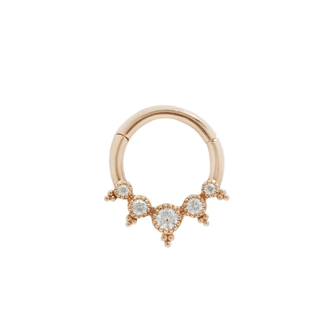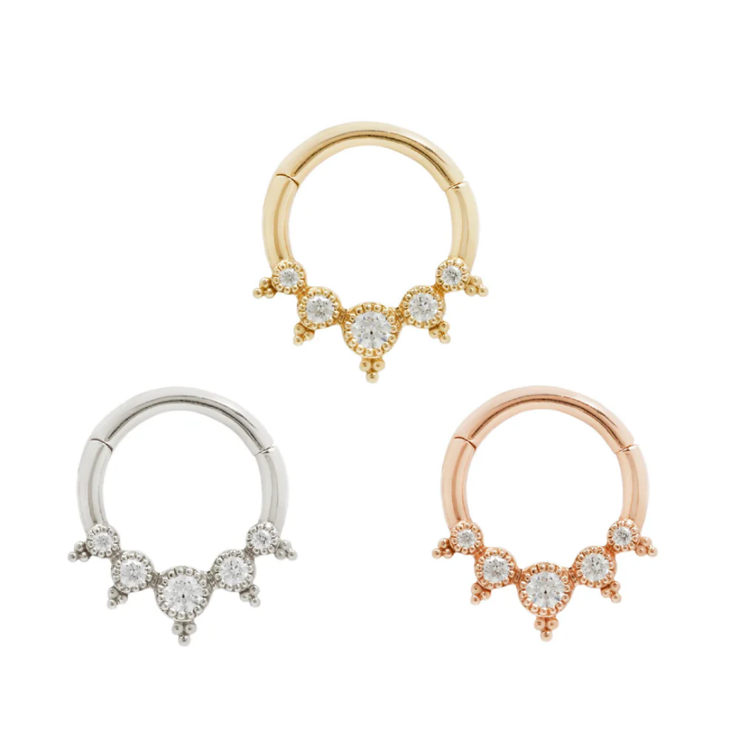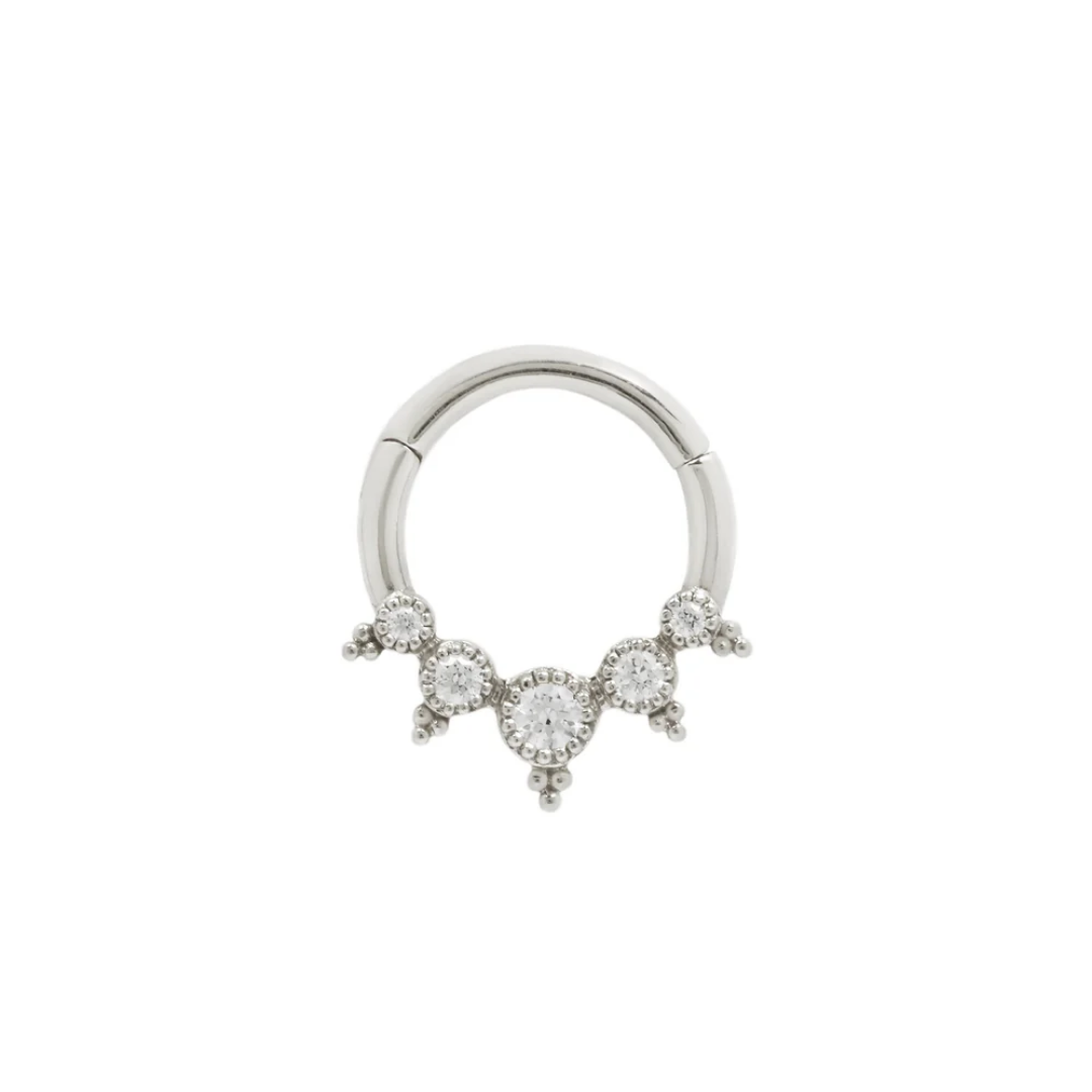 The Simone features five Swarovski CZ's with a handcrafted milgrain setting and beadwork. This vintage-inspired piece is truly one of a kind!
