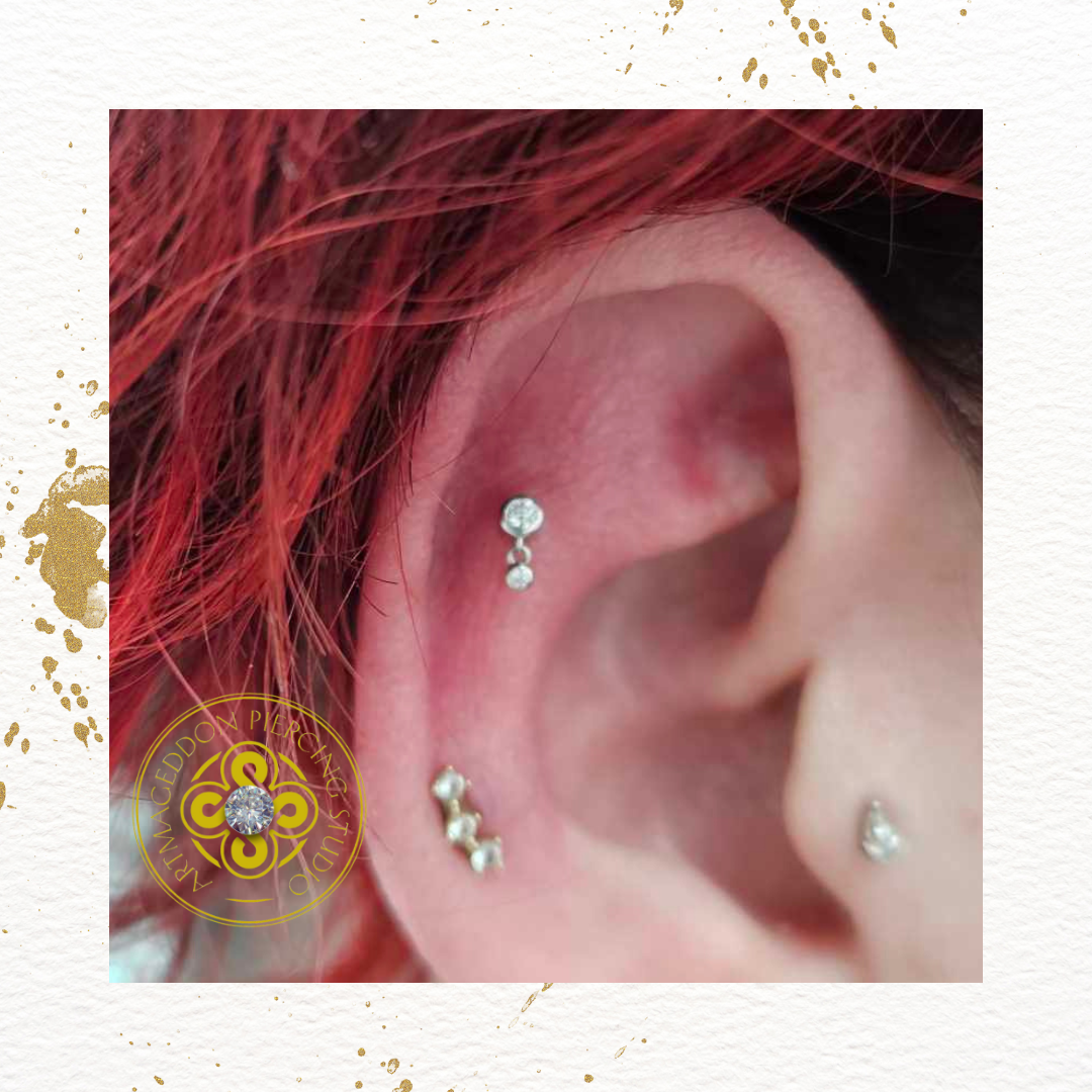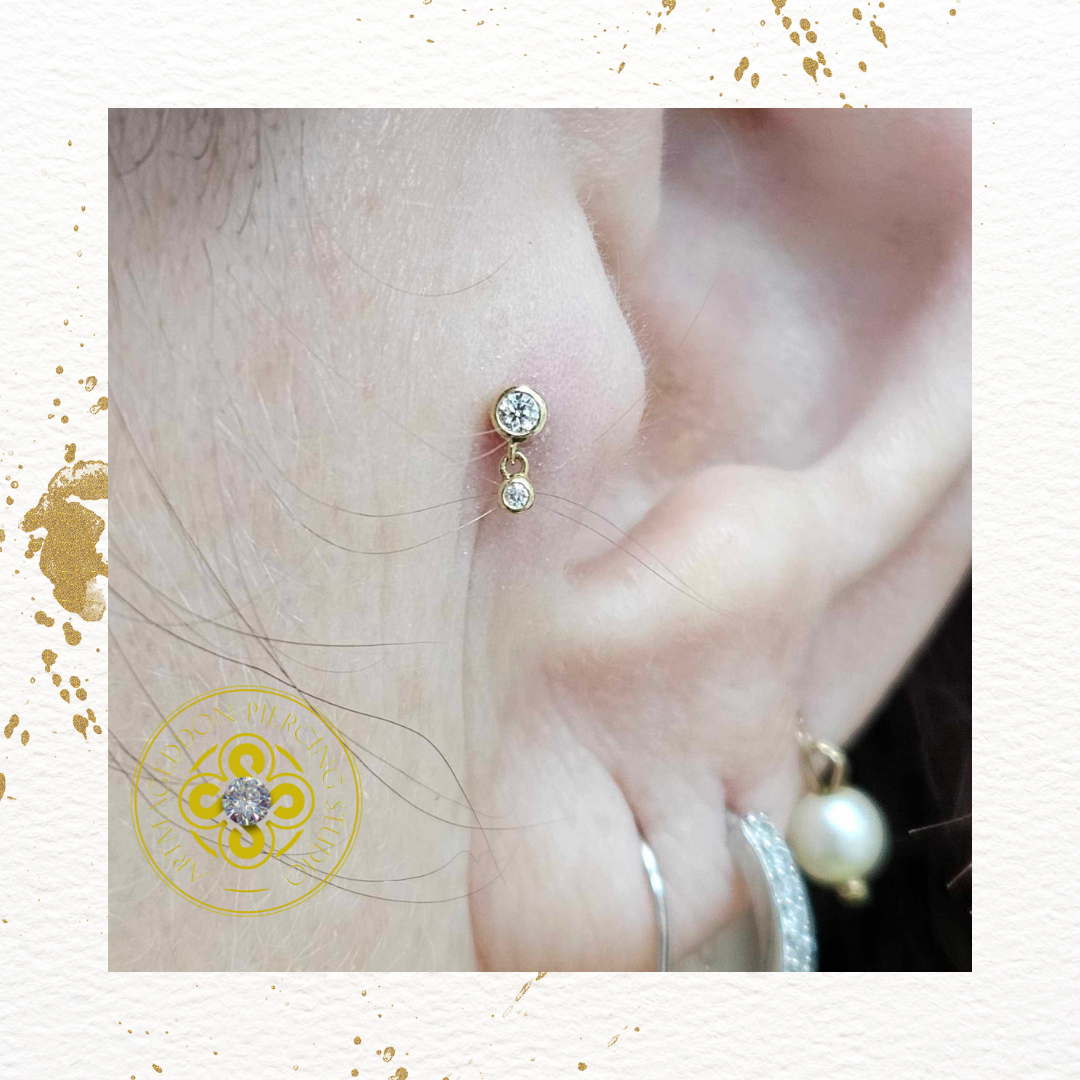 Embellish yourself with a dangle that adds sparkle and shine. Sutton creates movement and dimension in your curation. Bezel set Swarovski Crystal dangle for a fresh, minimalist style. Great for everyday wear in the rook, helix, lobe, and tragus.