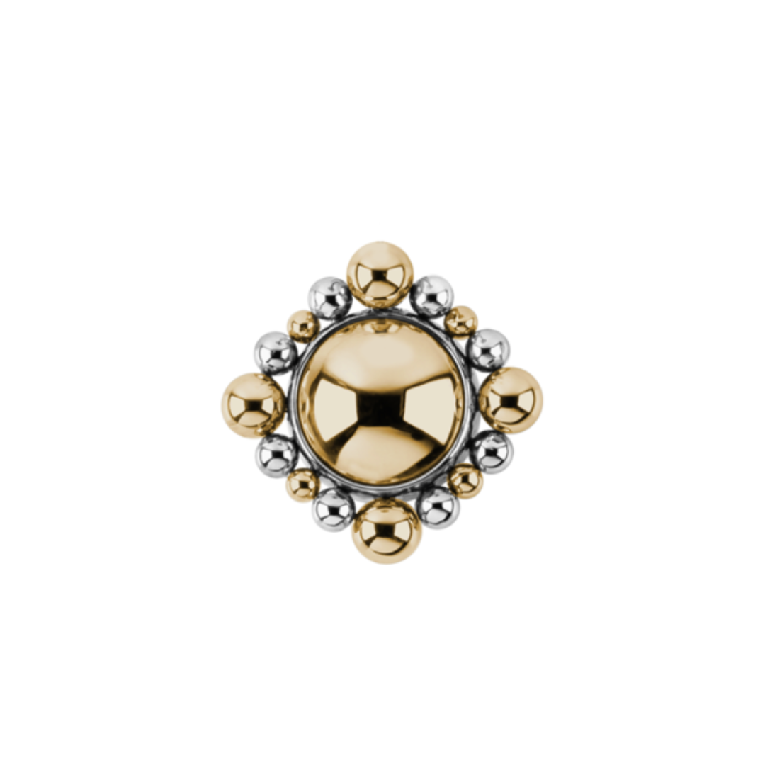 The Valentia end by Le Roi Jewelry brings striking symmetry and rich texture with its bold 14k yellow or rose gold centre surrounded by polished titanium and gold spheres. This mixed-metal piece offers a refined statement for flat, conch or lobe placements.