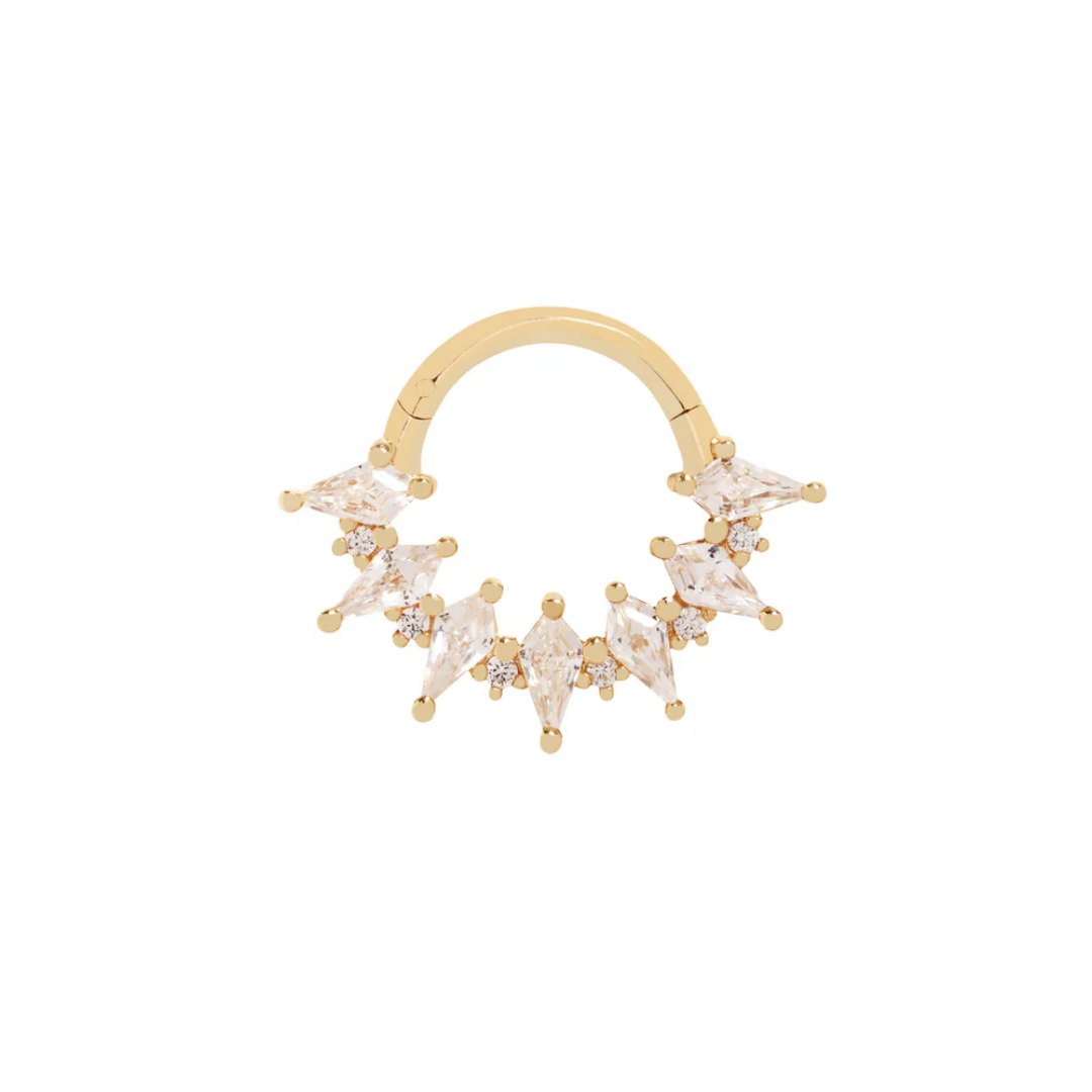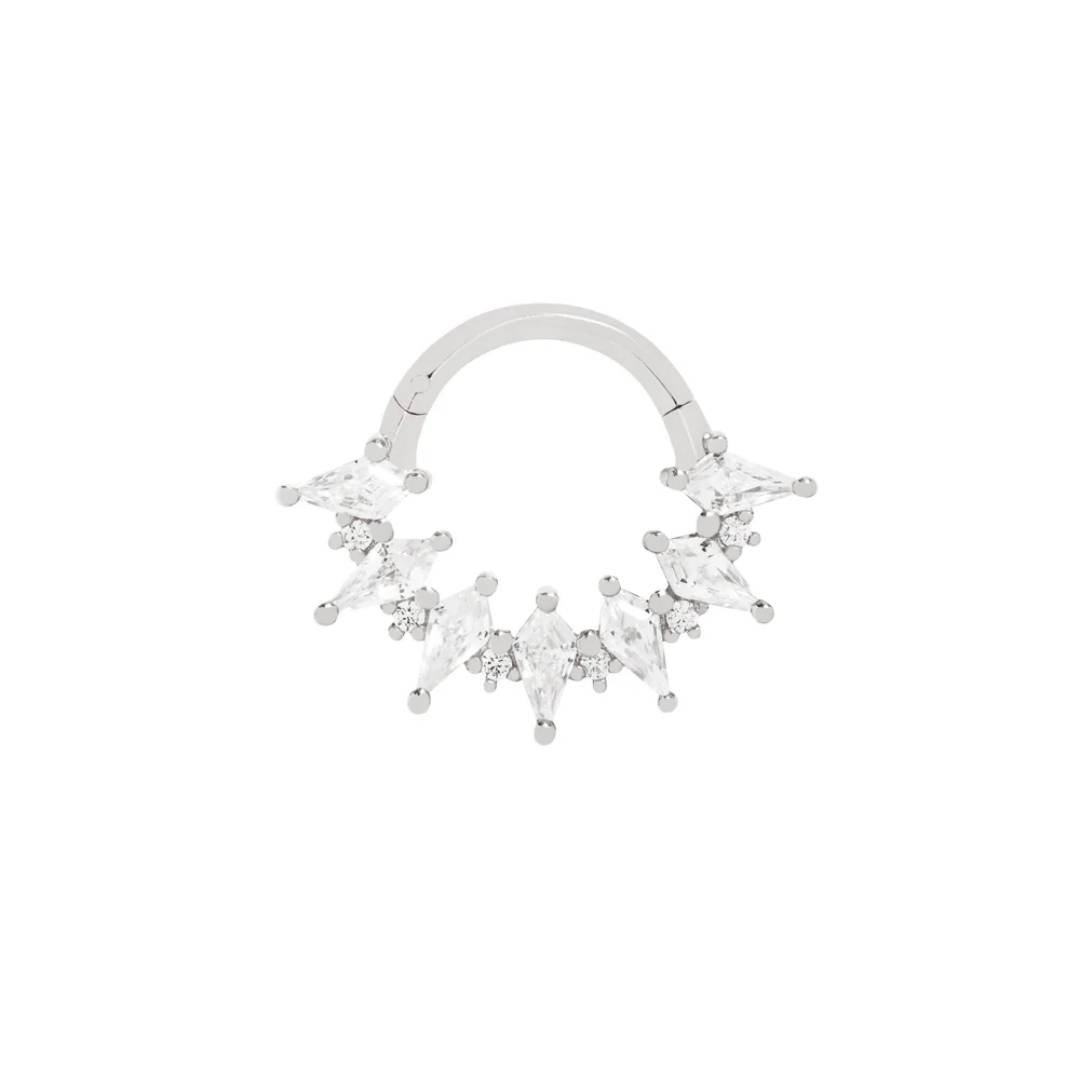 Unveil the magic of Wonderland, a clicker that blends bold design with radiant sparkle. Featuring kite-cut CZs, this septum and daith clicker adds a geometric twist to your piercing, offering a bold yet refined look.